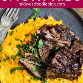 Tender, rich, bourbon braised beef nestled into a pillow of garlicky, creamy, sweet potato mash. The prep time is minimal and the beef does all the work in 4-5 hours in the crock while you get on with your day!